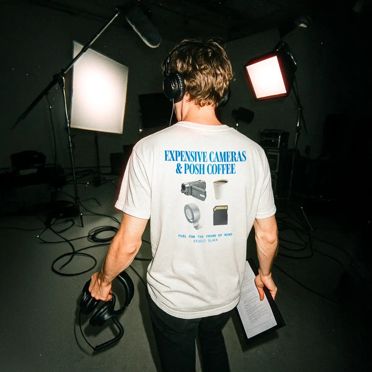 Made for the ones turning up to set with an SD card, some gaffer tape, and no sleep. This heavyweight tee pays tribute to balancing shot lists with caffeine fixes. Oversized fit, washed finish, and built to hold up through long days on set.