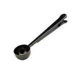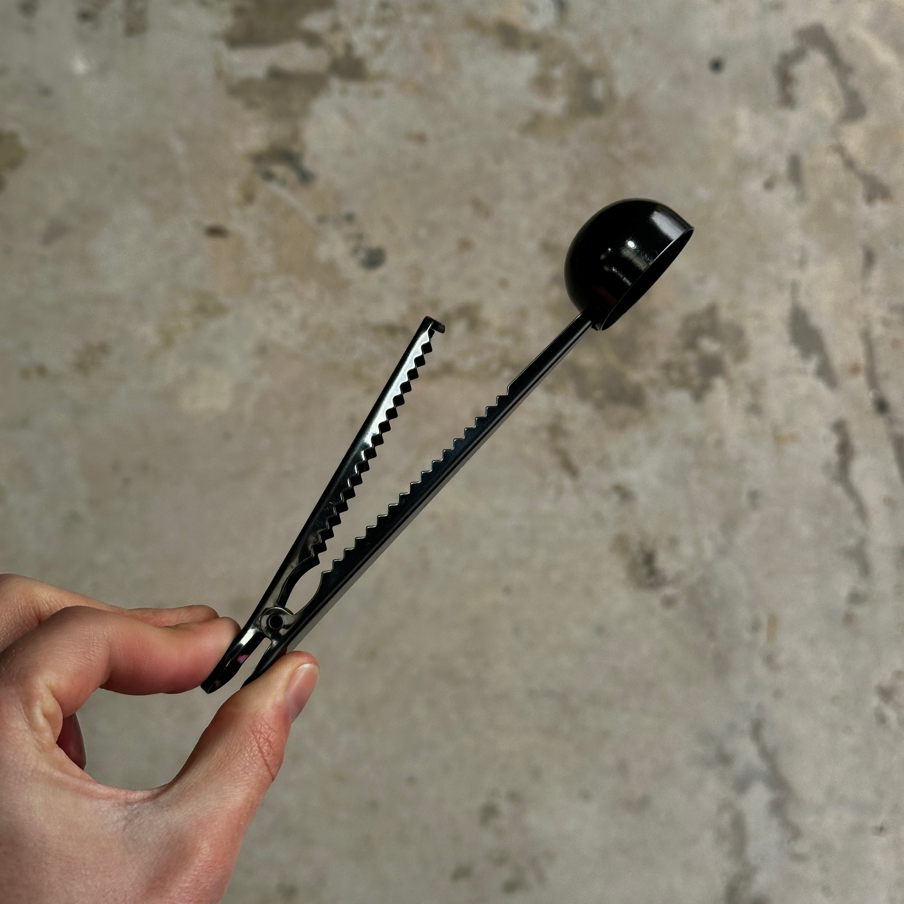 Black metal scoop that clips onto your coffee bag. Measure your grounds with precision, then seal in freshness. Two tools, one tidy solution.